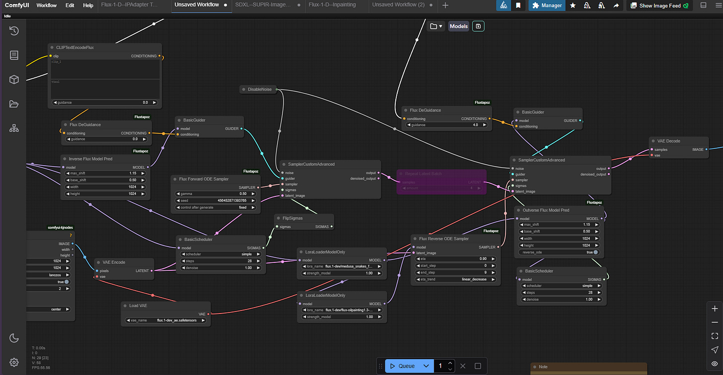 Frightened yet? This is ComfyUI, the leading local generative art (and more) application for local diffusion models. It’s a portion of a workflow implementing the RF Inversion technique discussed in [Rout], things start out a lot simpler, I assure you.
